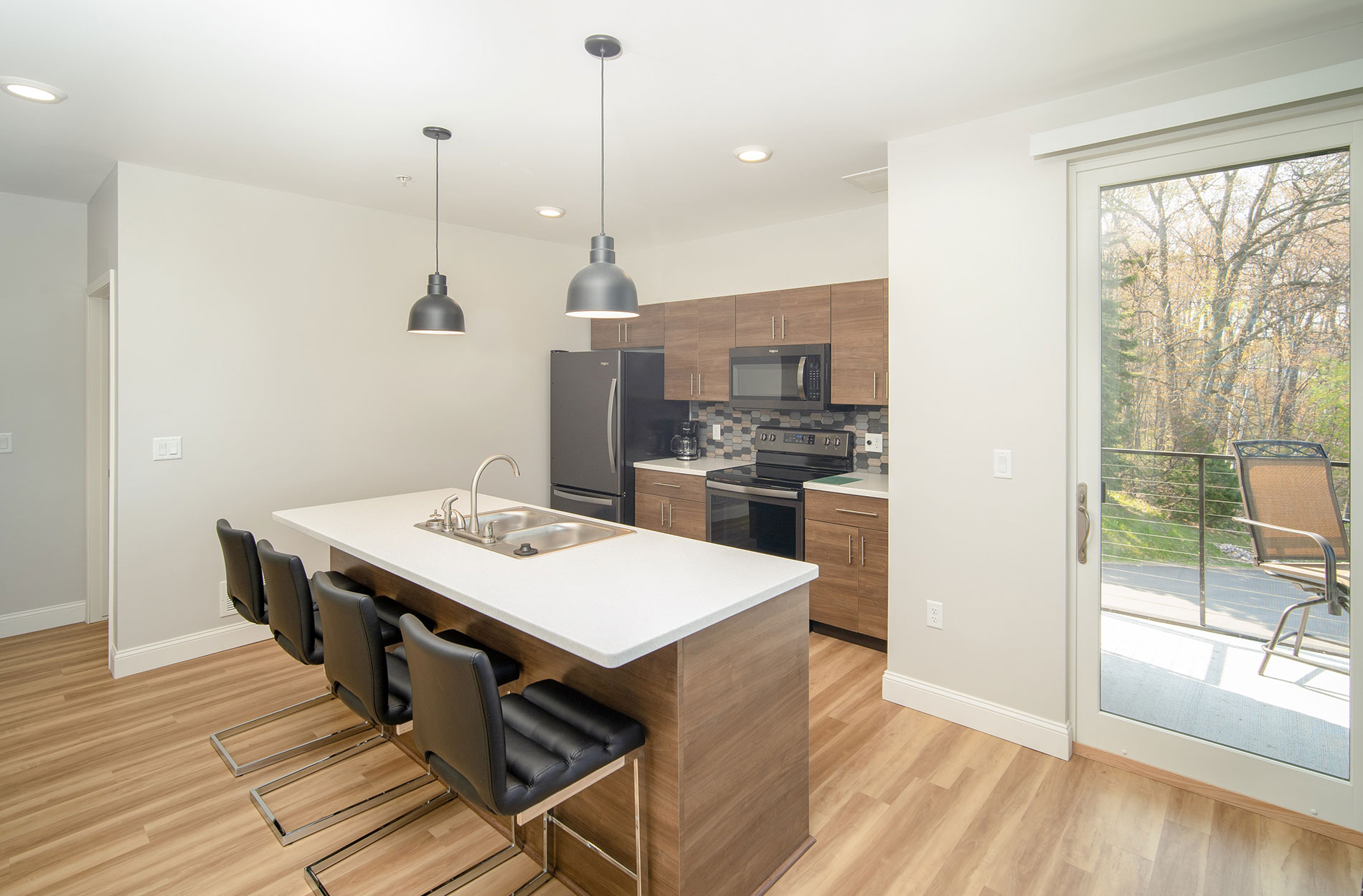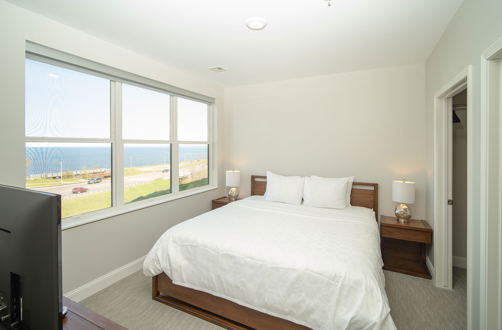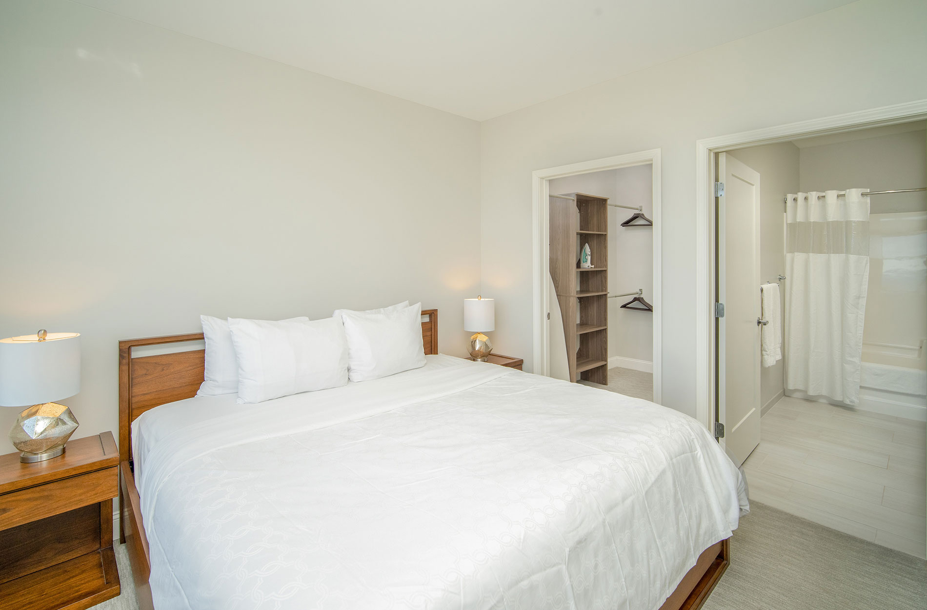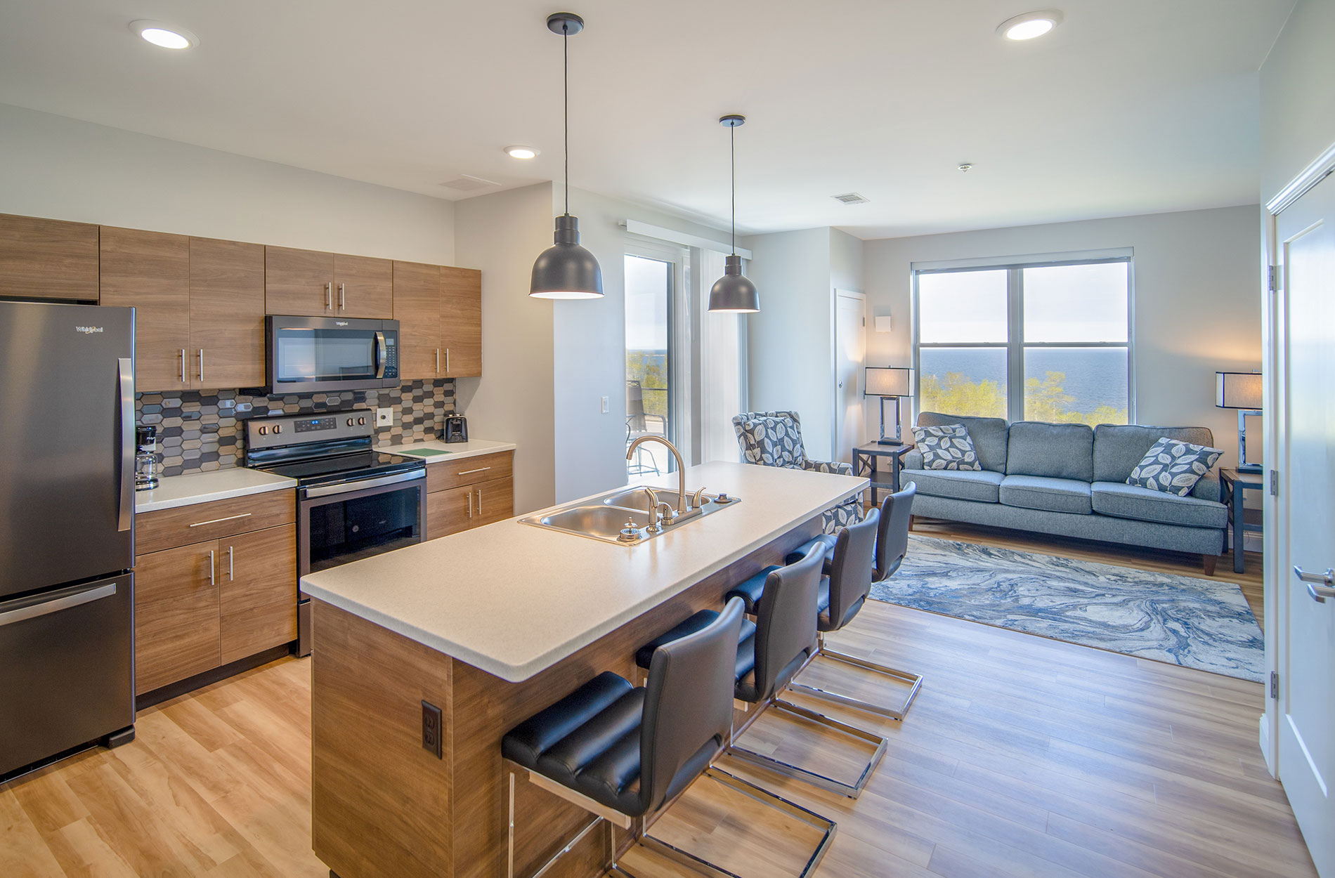 Starting at $2,000/month. Our two-bedroom, two-bath units offer an open living concept with views of the lake, private patios, kitchen islands, and spacious walk-in closets in the master bedrooms. Units are equipped with black stainless steel kitchen appliances, high efficiency washers and dryers, high-speed wireless internet, and 200 channels of HD cable television.