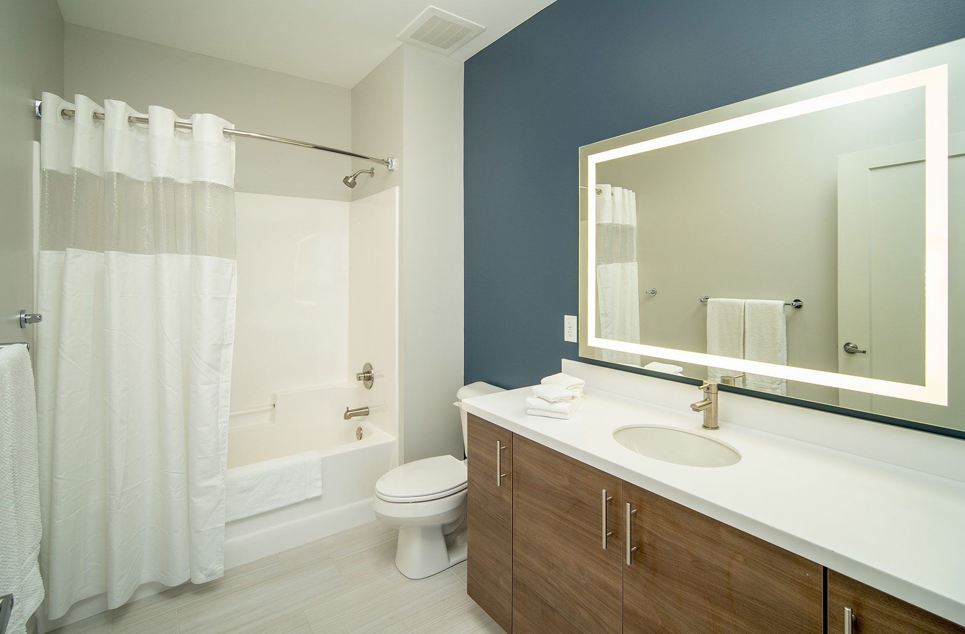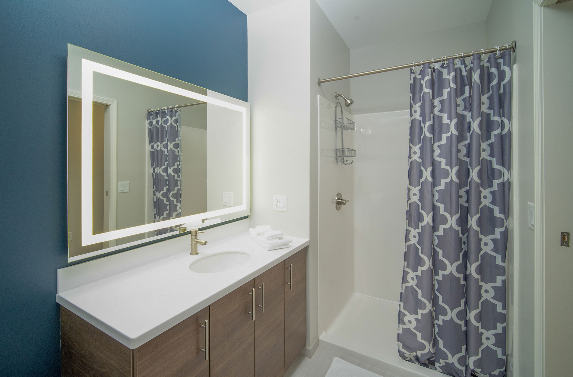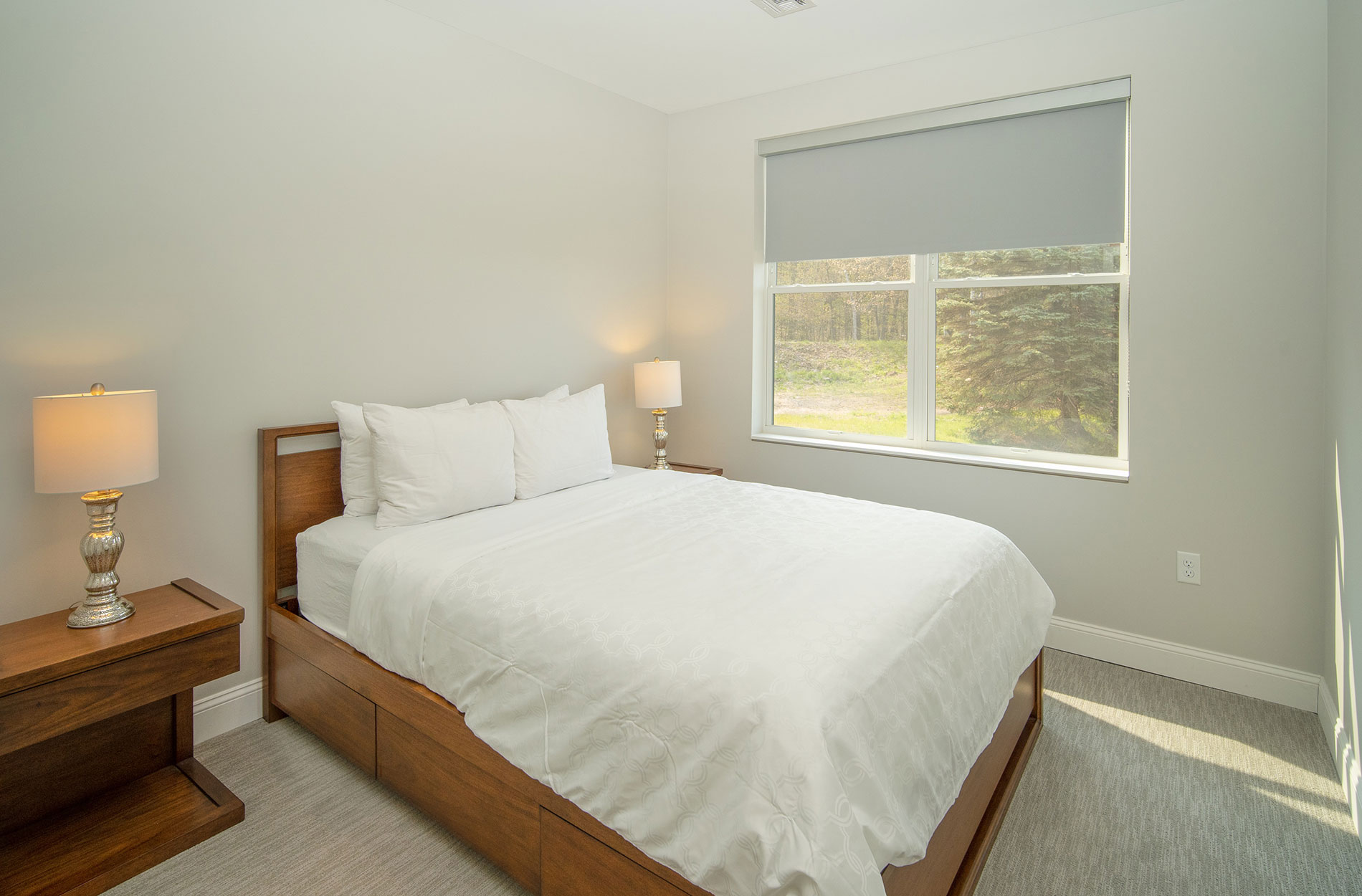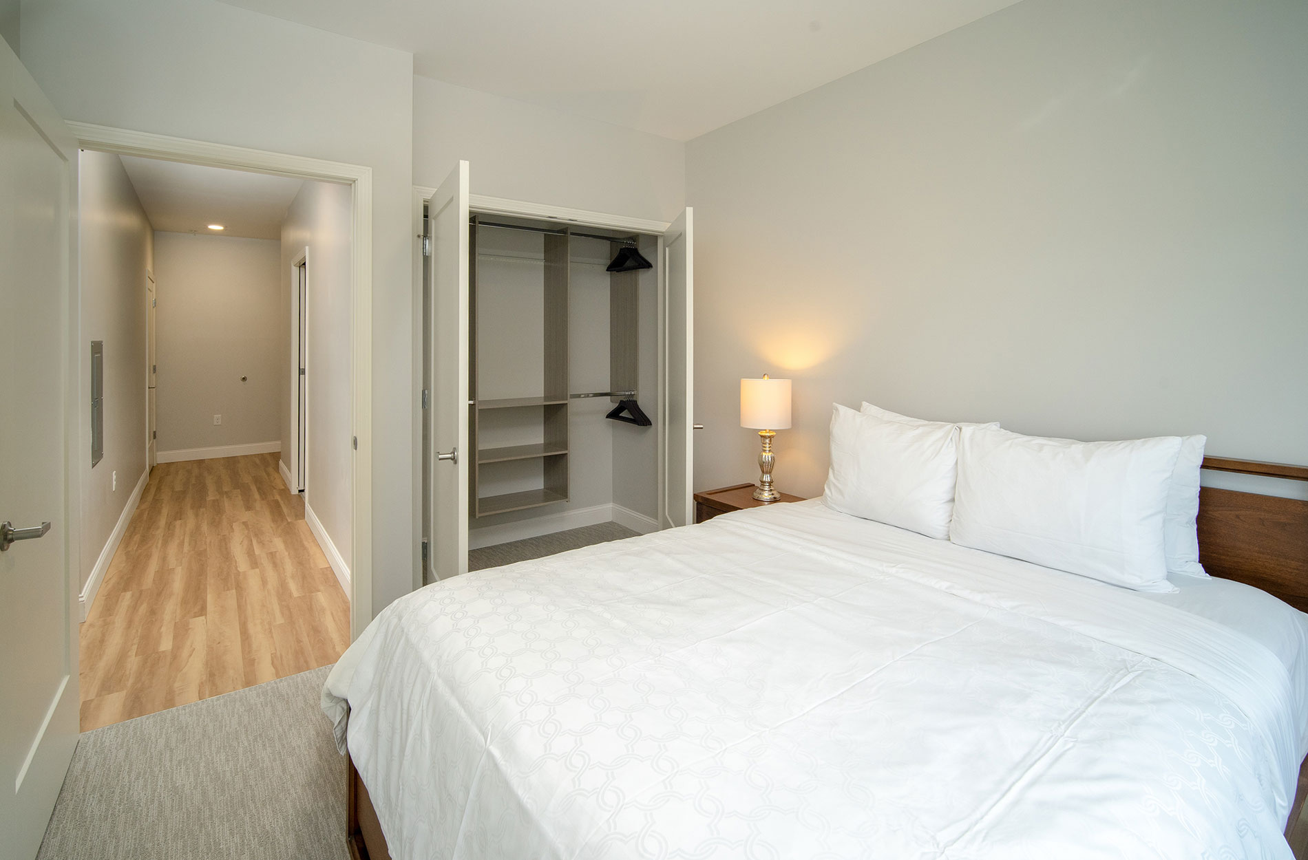 Starting at $2,000/month. Our two-bedroom, two-bath units offer an open living concept with views of the lake, private patios, kitchen islands, and spacious walk-in closets in the master bedrooms. Units are equipped with black stainless steel kitchen appliances, high efficiency washers and dryers, high-speed wireless internet, and 200 channels of HD cable television.